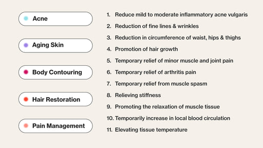 Blue and red light are used to kill acne bacteria to reduce and prevent breakouts, while reducing inflammation, pimples, and redness.
