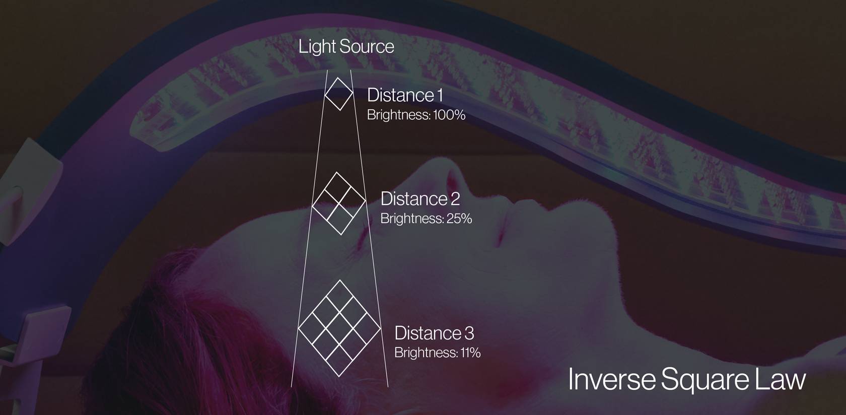 W terapii światłem o niskim natężeniu, moc i odległość od źródła światła są bezpośrednio ze sobą powiązane . prawo odwrotnych kwadratów opisuje, w jaki sposób każde stopniowe zwiększenie odległości od źródła światła może powodować spadek wykładniczy pod względem intensywności — co oznacza, że odległość może szybko zmniejszyć skuteczność leczenia.